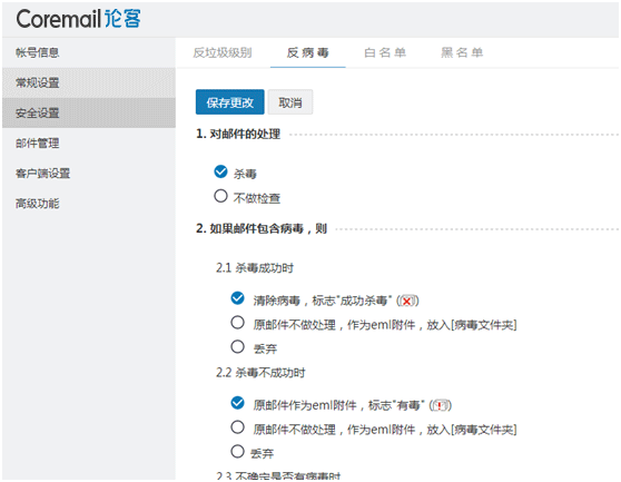 - Coremail 系统可提供免费的杀毒引擎,可自动帮助您扫描邮箱收到的各种病毒邮件。如果您收到的邮件附件扫描后发现了病毒,您可删除病毒邮件,或再联系发信人,要求其在用杀毒软件清除病毒后重新发送附件。